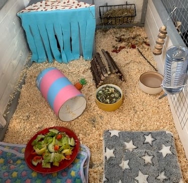Rabbits and Guinea pigs will receive daily exercise in spacious outside runs, cuddles and interactions.